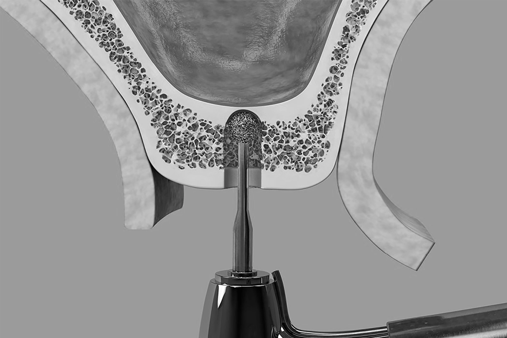 The gum is carefully opened to expose the underlying bone. A small opening drills into the bone to reach the maxillary sinus cavity.